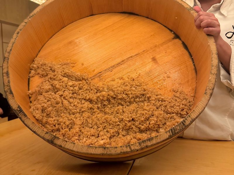 The pale pink slice of kohada rests on a celadon plate, its silver skin scored with precise diagonal cuts that catch the warm light from the counter. Behind the sushi bar, white-coated hands move with practiced efficiency, grinding sesame in a suribachi (mortar) with steady circular motions.