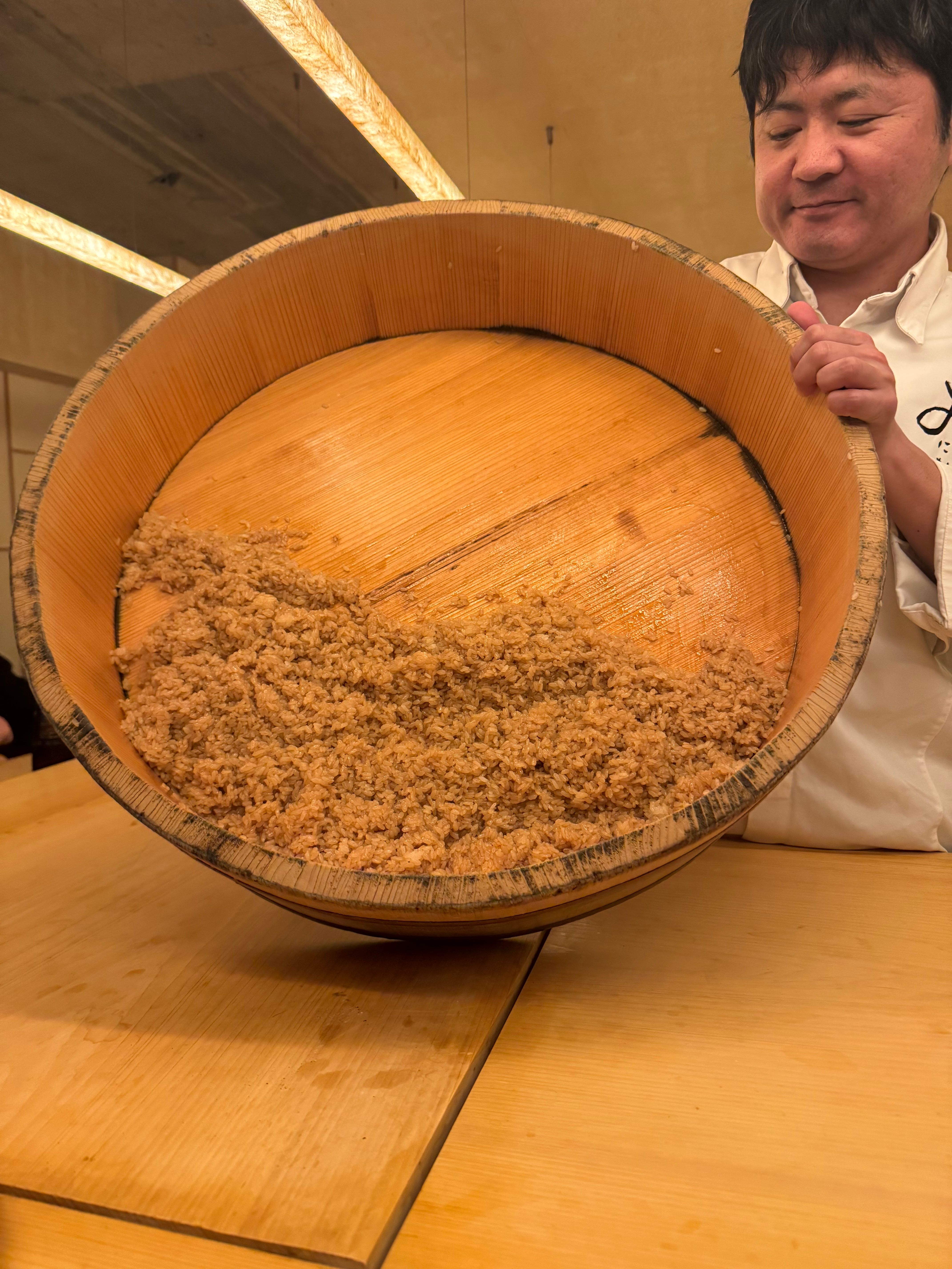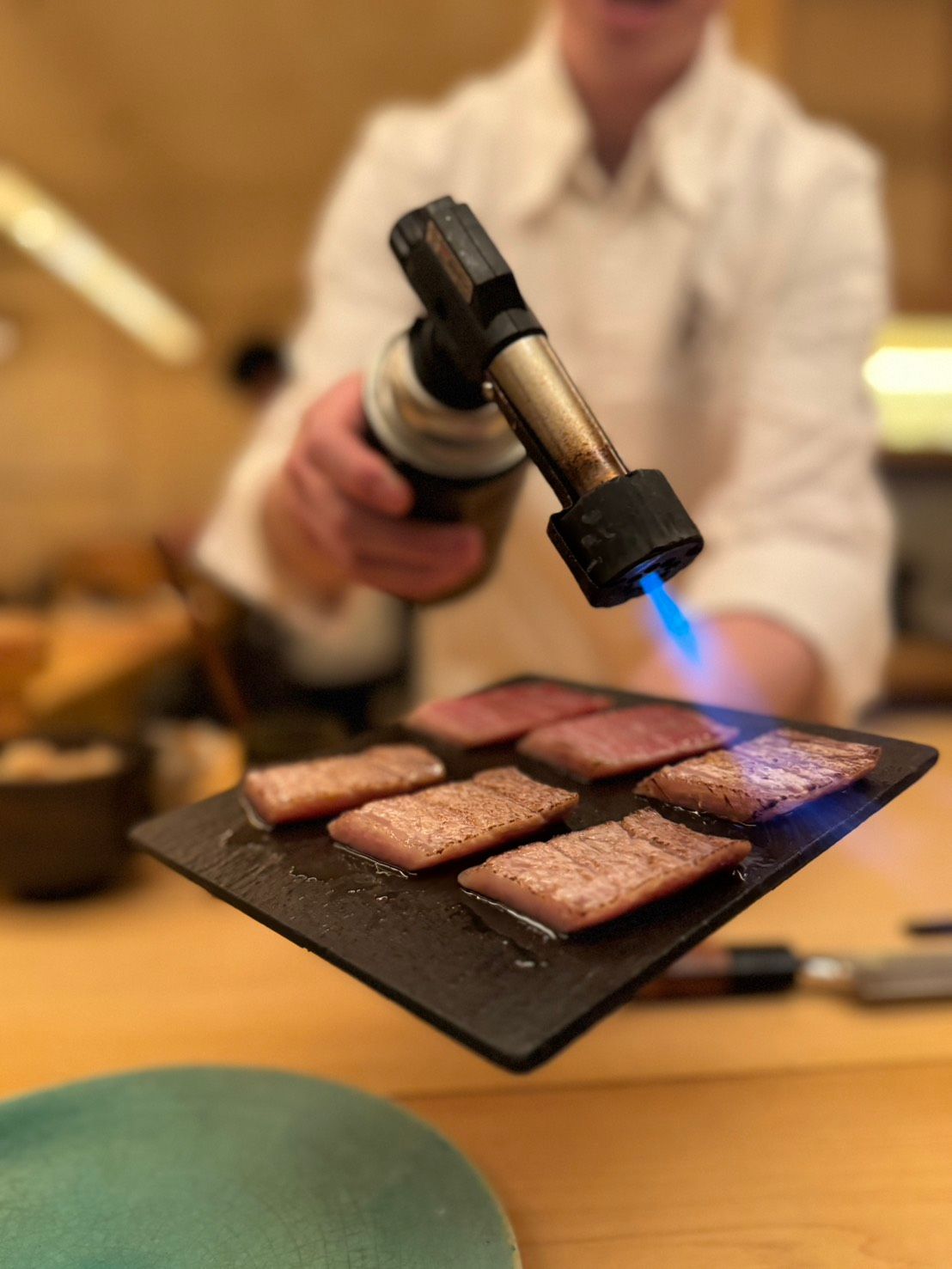 The pale pink slice of kohada rests on a celadon plate, its silver skin scored with precise diagonal cuts that catch the warm light from the counter. Behind the sushi bar, white-coated hands move with practiced efficiency, grinding sesame in a suribachi (mortar) with steady circular motions.